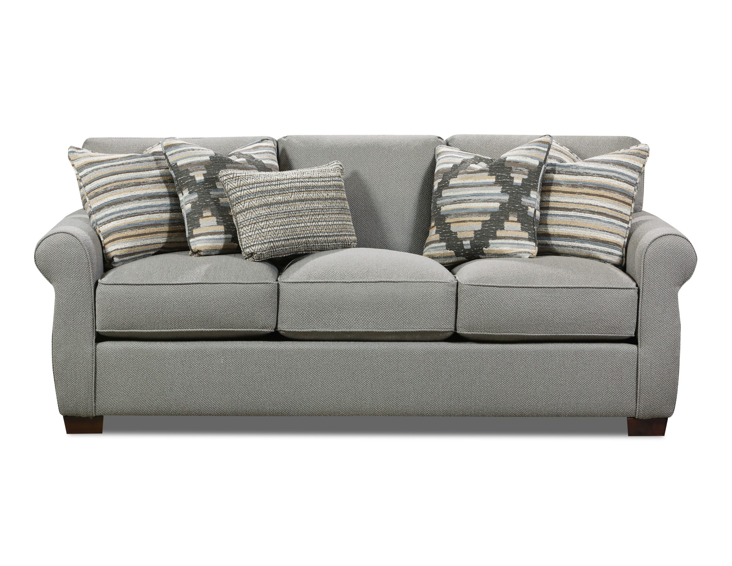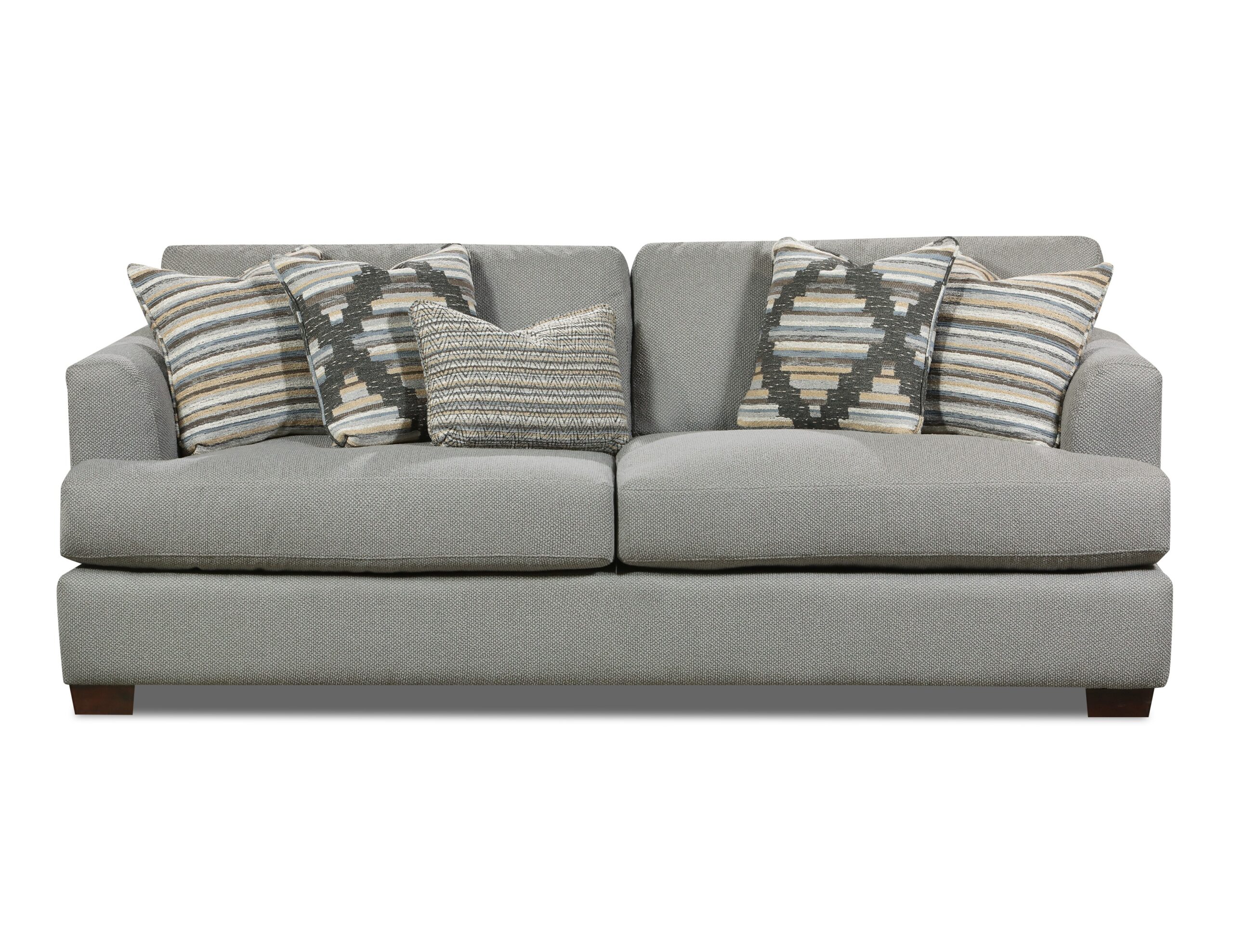This combination features a sleek and contemporary design. The fabric has a subtle woven texture that adds depth and visual interest while maintaining a neutral tone suitable for various décor styles. Accent pillows in coordinating patterns—featuring muted tones of gray, cream, and beige—introduce soft contrast and a touch of rustic charm. Together, the fabric combination creates a sophisticated yet cozy ambiance perfect for modern living spaces.