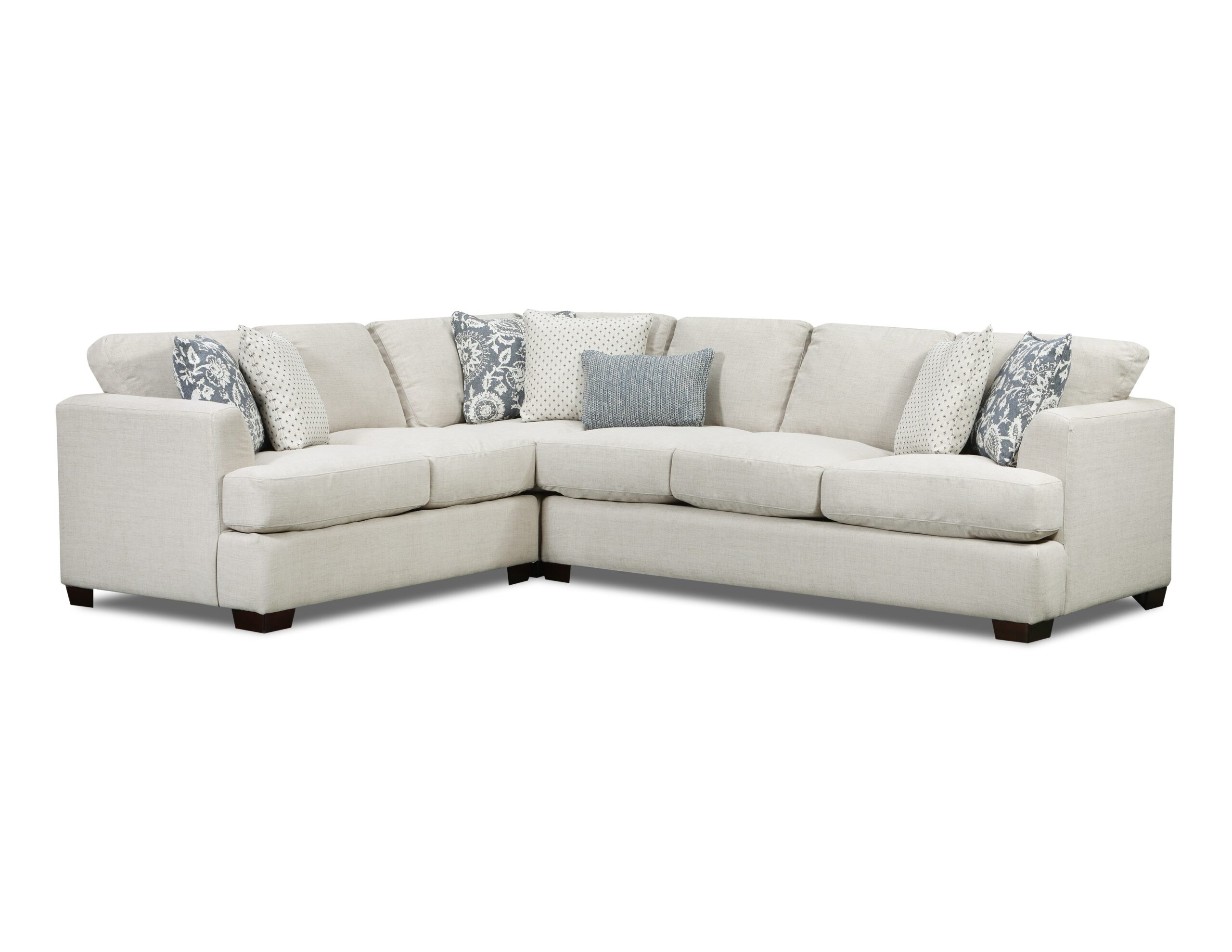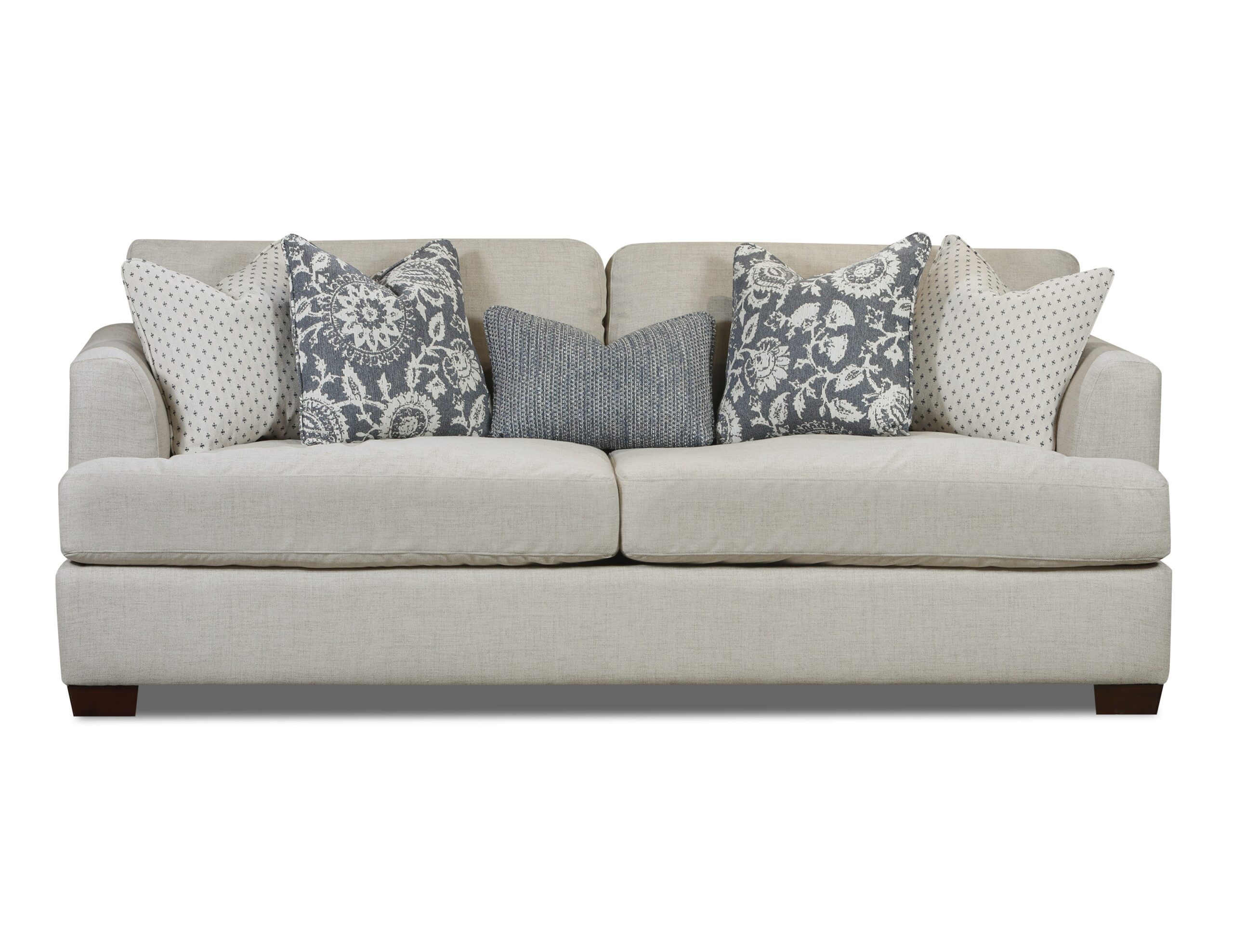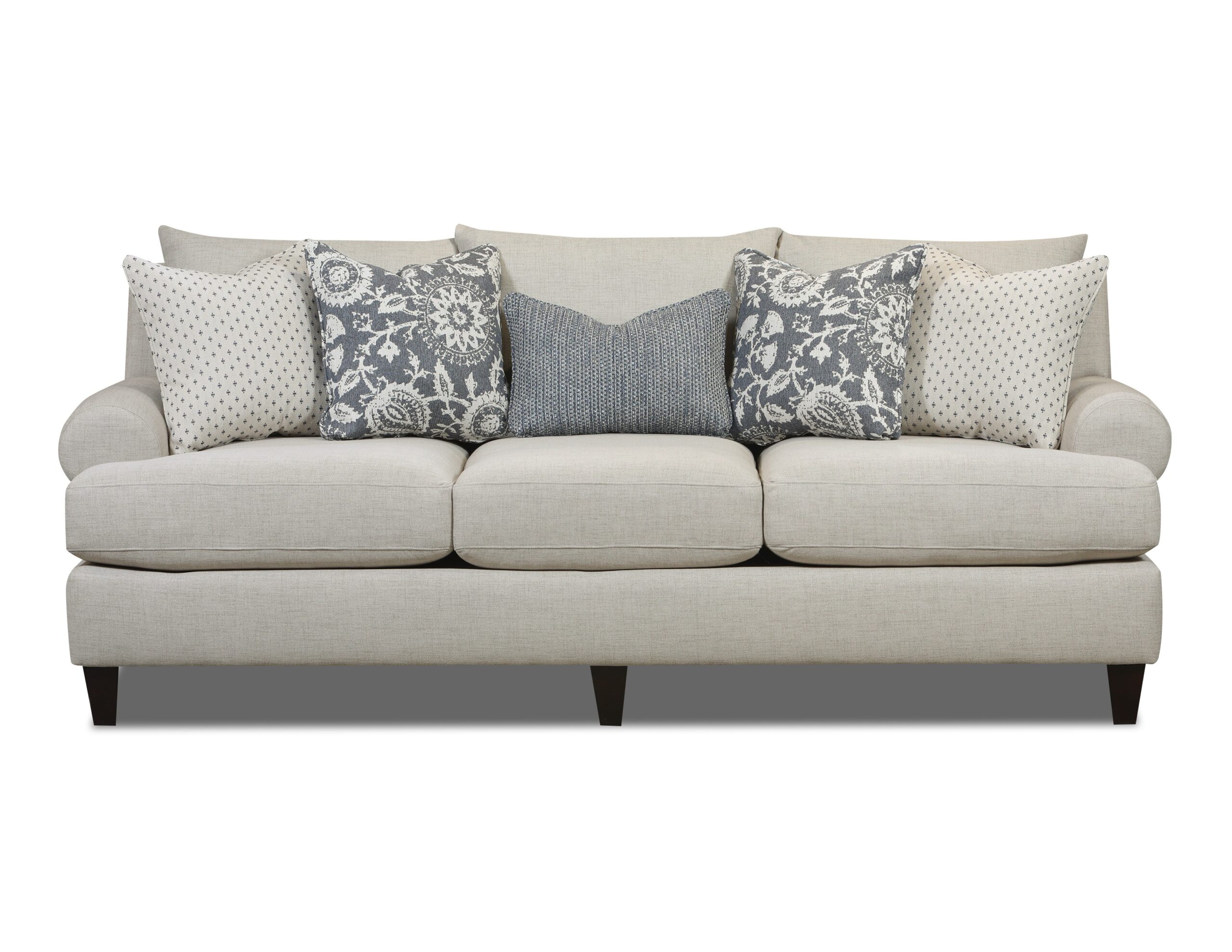 This collection is a soft, linen-textured fabric in a light beige tone that offers a timeless and neutral foundation. The accent pillows blend soft charcoal blues and creams with floral, geometric, and knit-inspired patterns for a layered, sophisticated look. This fabric combination effortlessly merges classic and contemporary elements, creating a calm and balanced visual appeal. It’s an ideal choice for spaces that favor a relaxed yet polished aesthetic.