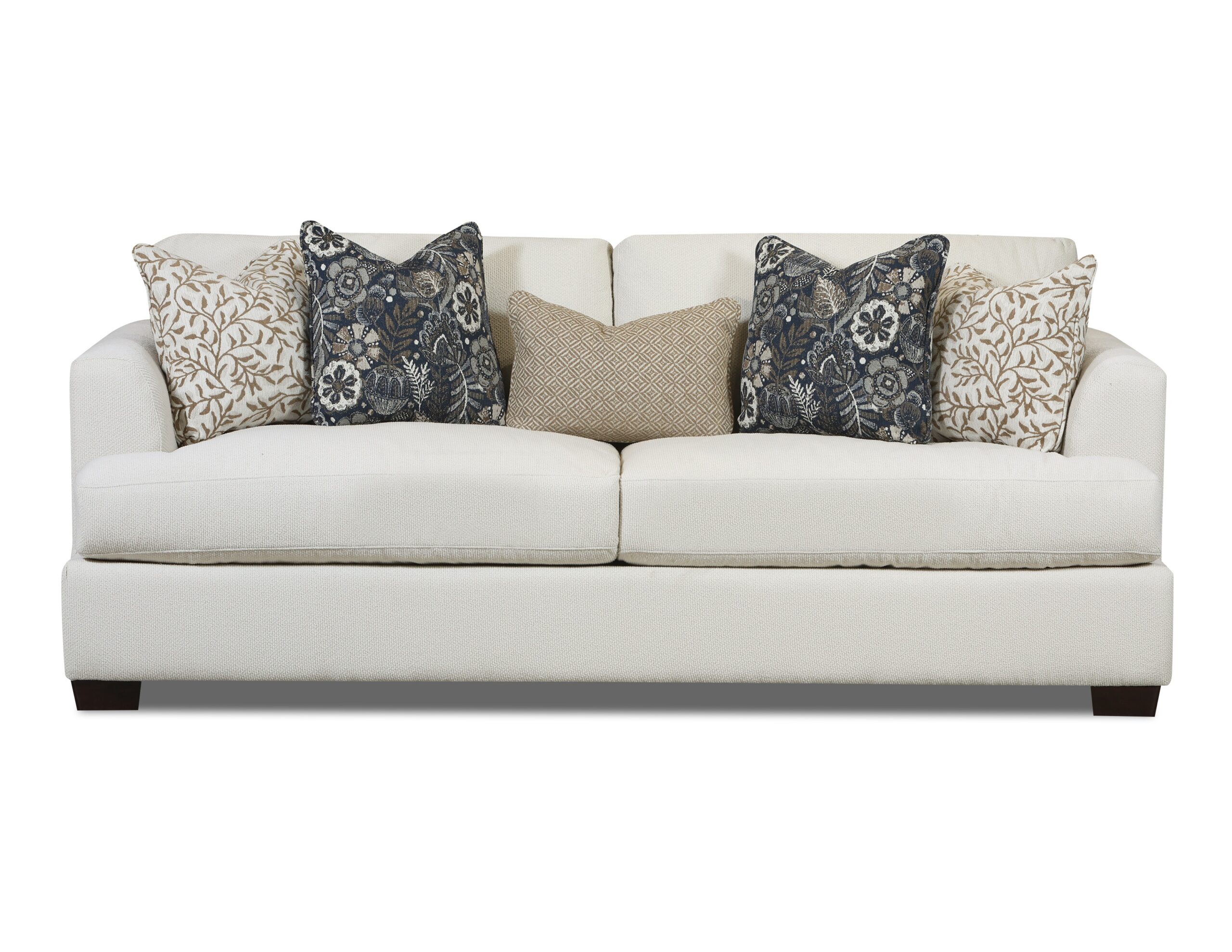 This collection showcases a clean, creamy neutral fabric with a subtle, textured weave for added elegance. The cushion arrangement features an inviting mix of earthy tones, combining botanical prints, geometric patterns, and deep navy floral designs. These accent pillows introduce visual interest and contrast, enhancing the warmth and sophistication of the overall look. The fabric combination exudes a refined, nature-inspired aesthetic perfect for transitional or classic interiors.