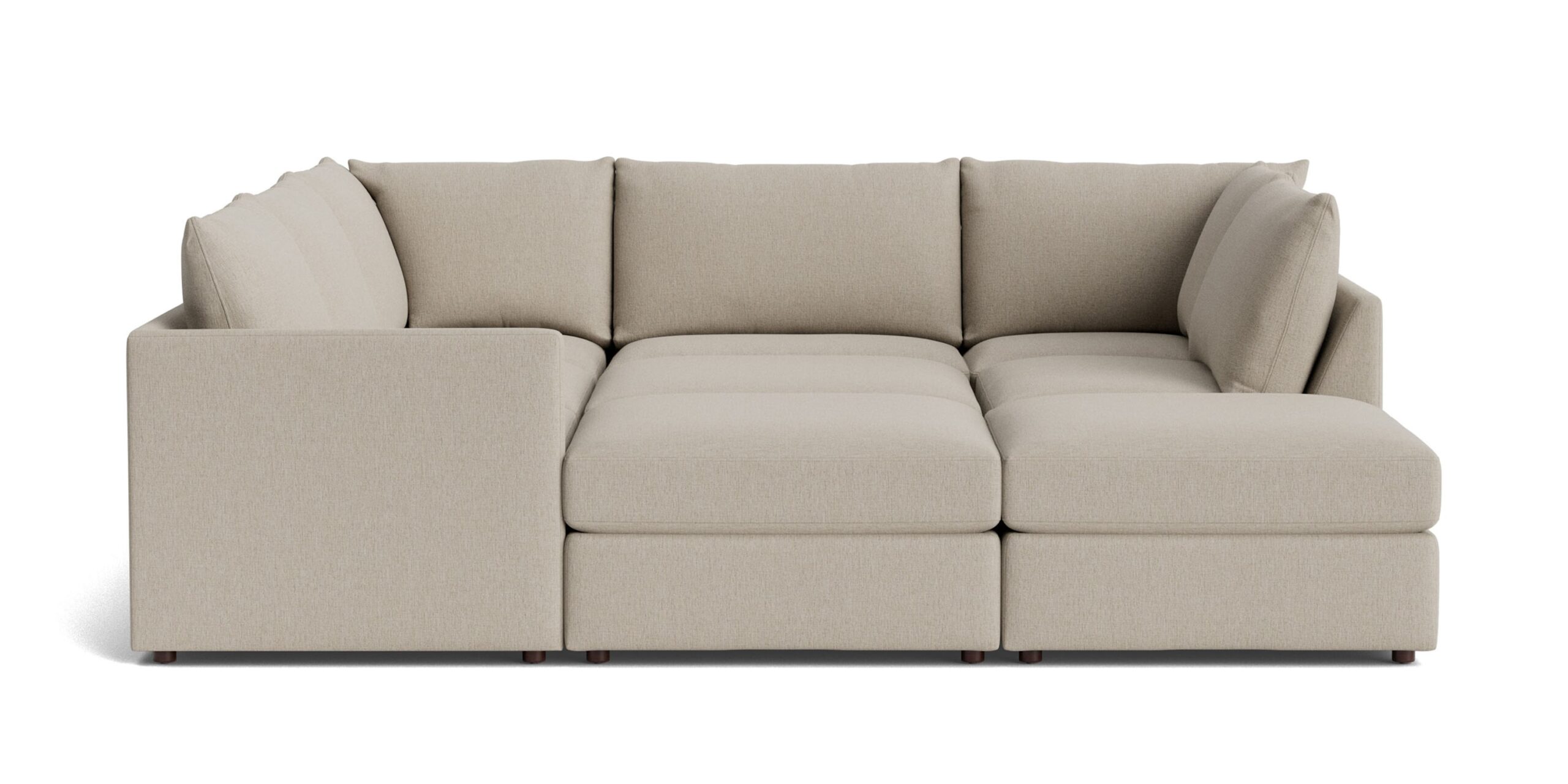 Invite extended family. Friends, too. The all-welcoming Beckham Pit Sectional is a modular sectional offering endless possibilities to be as large or small as needed. All pieces are top-stitched for durability, with weltless box seat cushions and loose knife edge back. Back and seat cushions are removable for easy cleaning. Wood legs are finished in walnut tone. Our best price fabrics are in Straw or Bone performance basket weave fabric and are in stock and ready to ship. Beckham can also be special ordered in any of our 600+ fabrics! Pillows are icing on the cake! We don’t want to assume your perfect pillow, so this piece does not come standard with accent pillows. We have lots of choices online to shop and your local design consultant would even be happy to guide you through designing your perfect custom pillow in store.